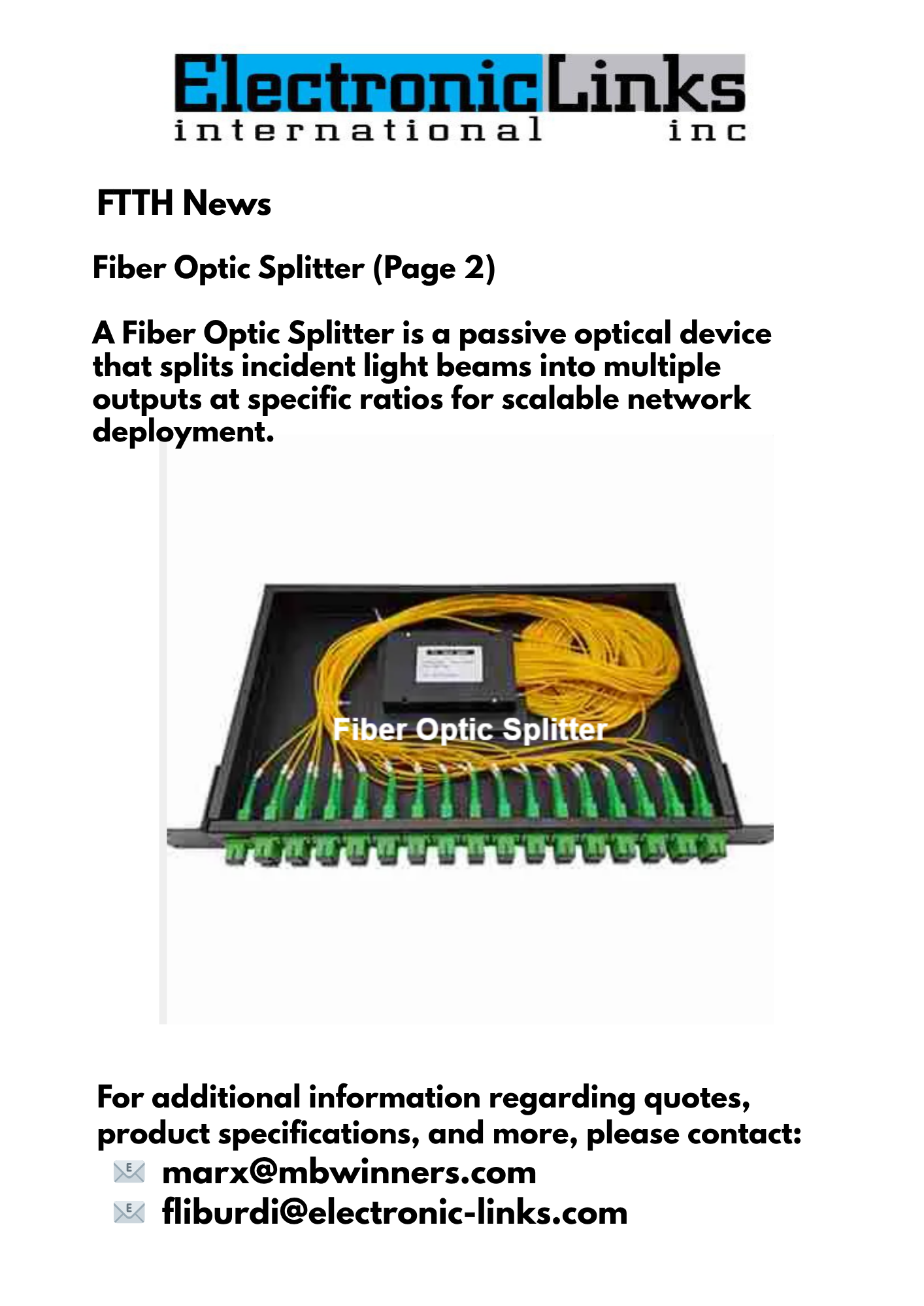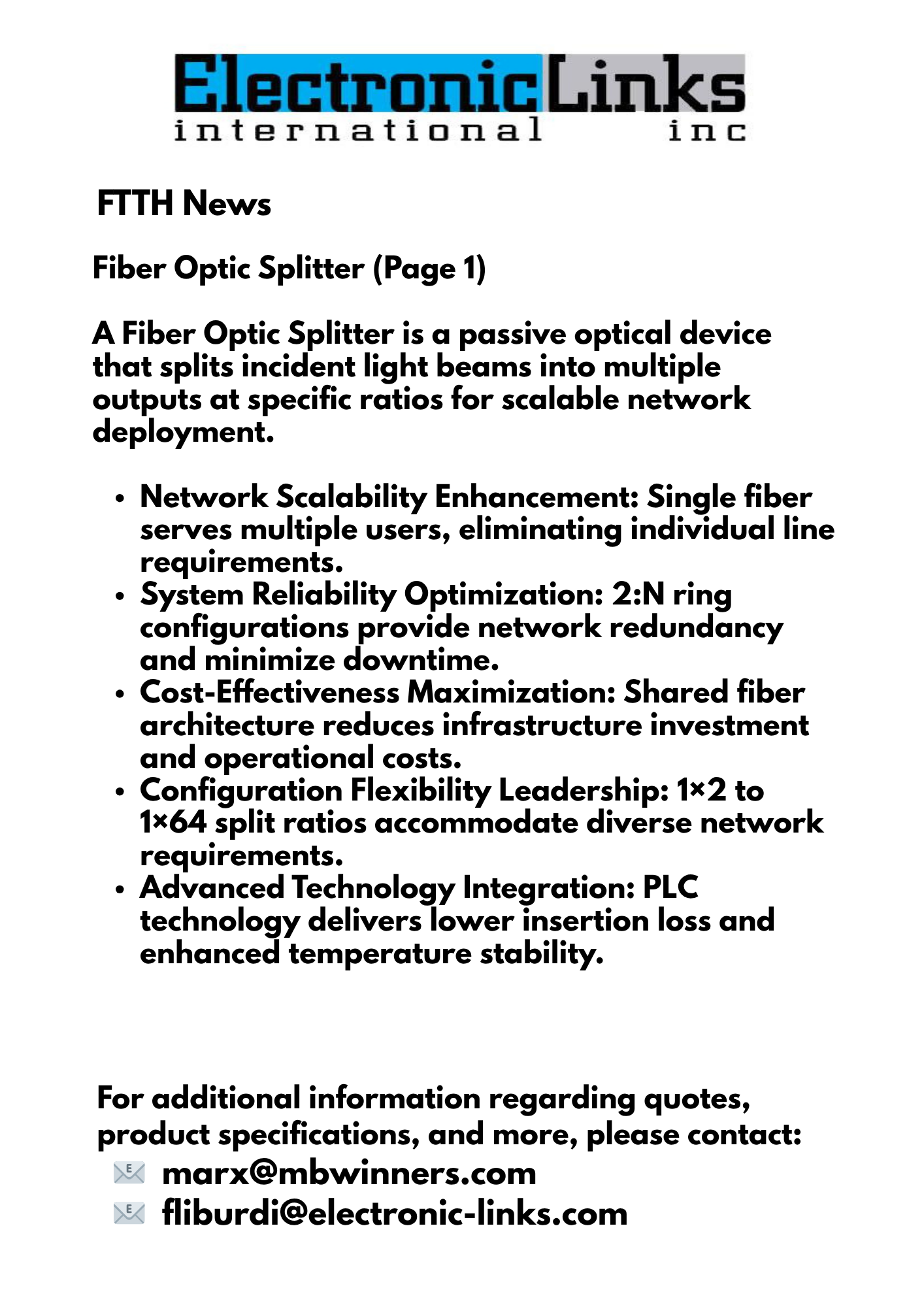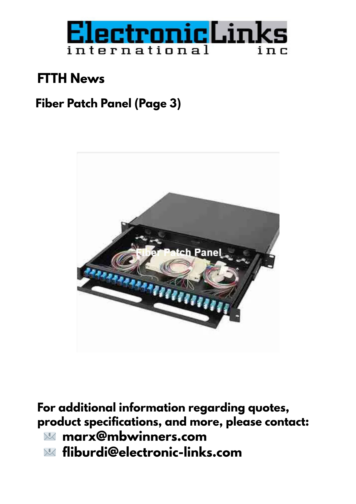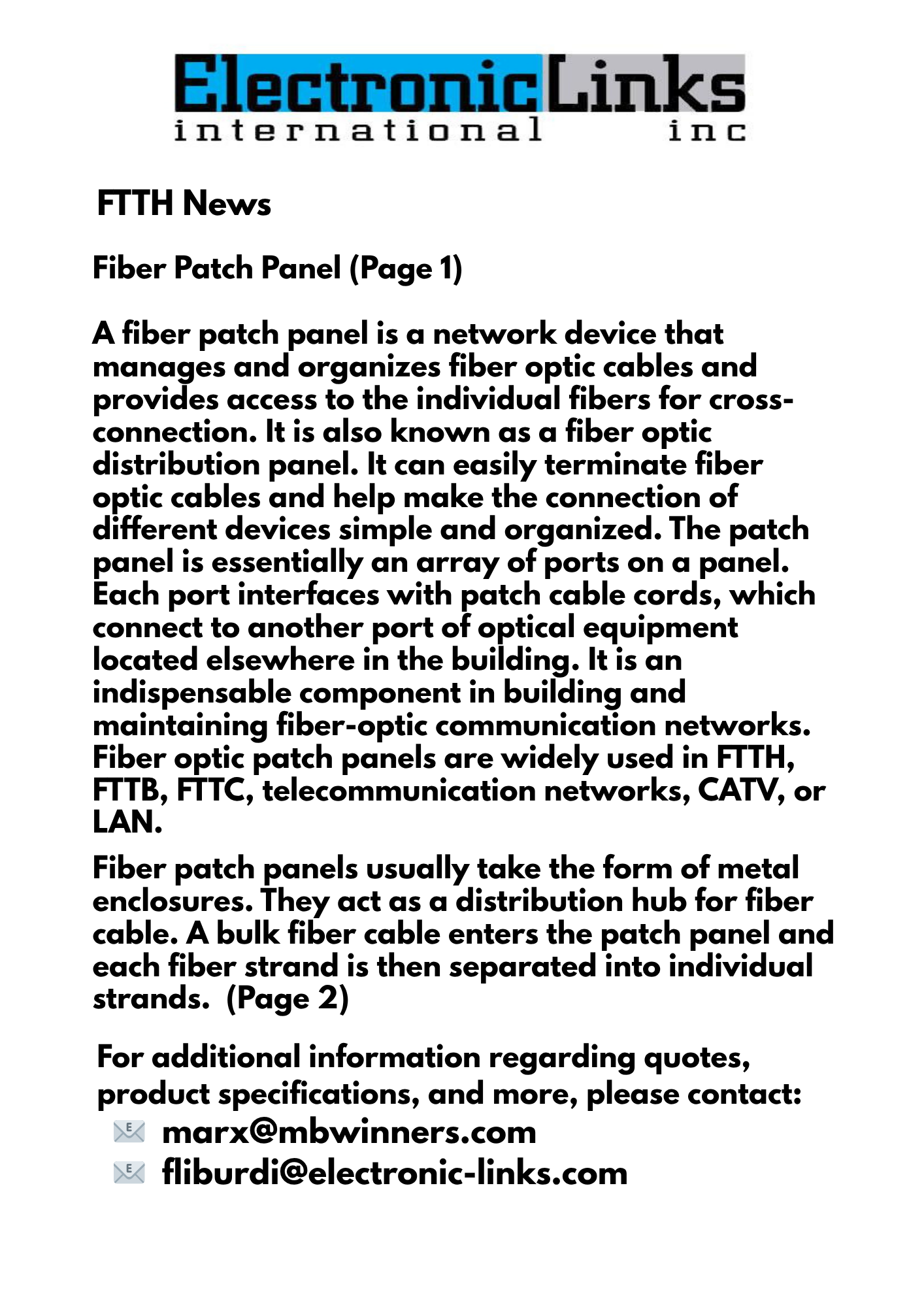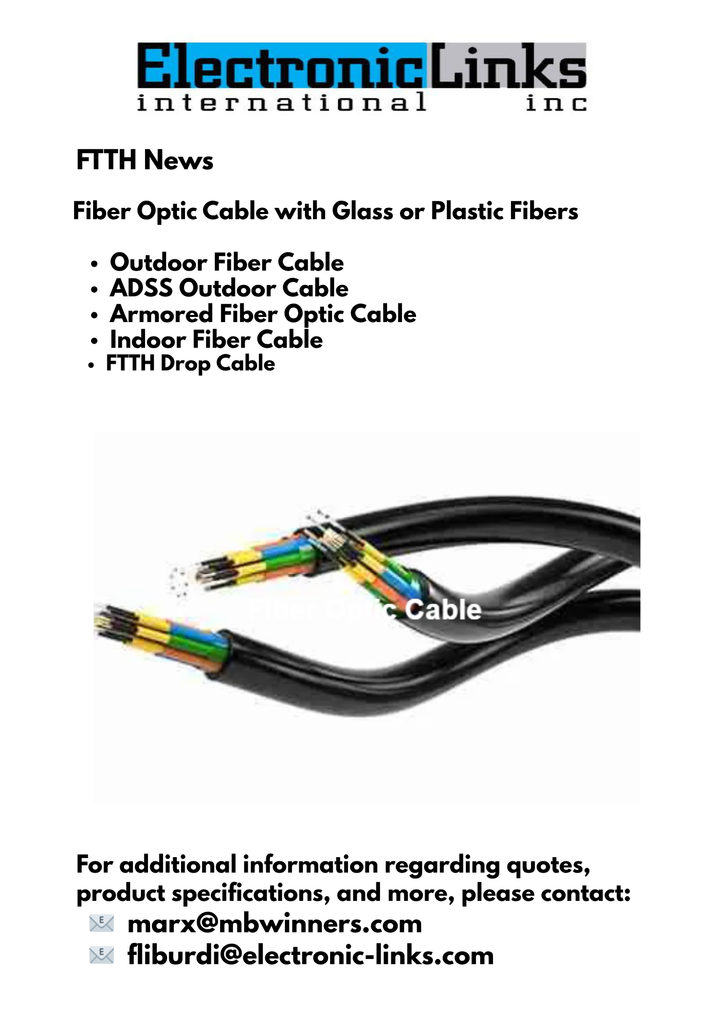 Electronic Links International, Inc., with its headquarters in the US and a branch in Italy has reached an agreement with Bwinners, with headquarters in China, whereby ELII will be representing and distributing the FTTH products produced by Bwinners in the following territories: US, Canada, Mexico, and Europe
