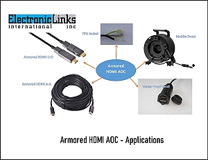 Armored HDMI AOC – Applications Electronic Links International, Inc. – Introducing an Armored HDMI AOC with lengthup to 100 meters. The cable are available in drum and with protective cups. Typical application are: video, security, stadium systems.